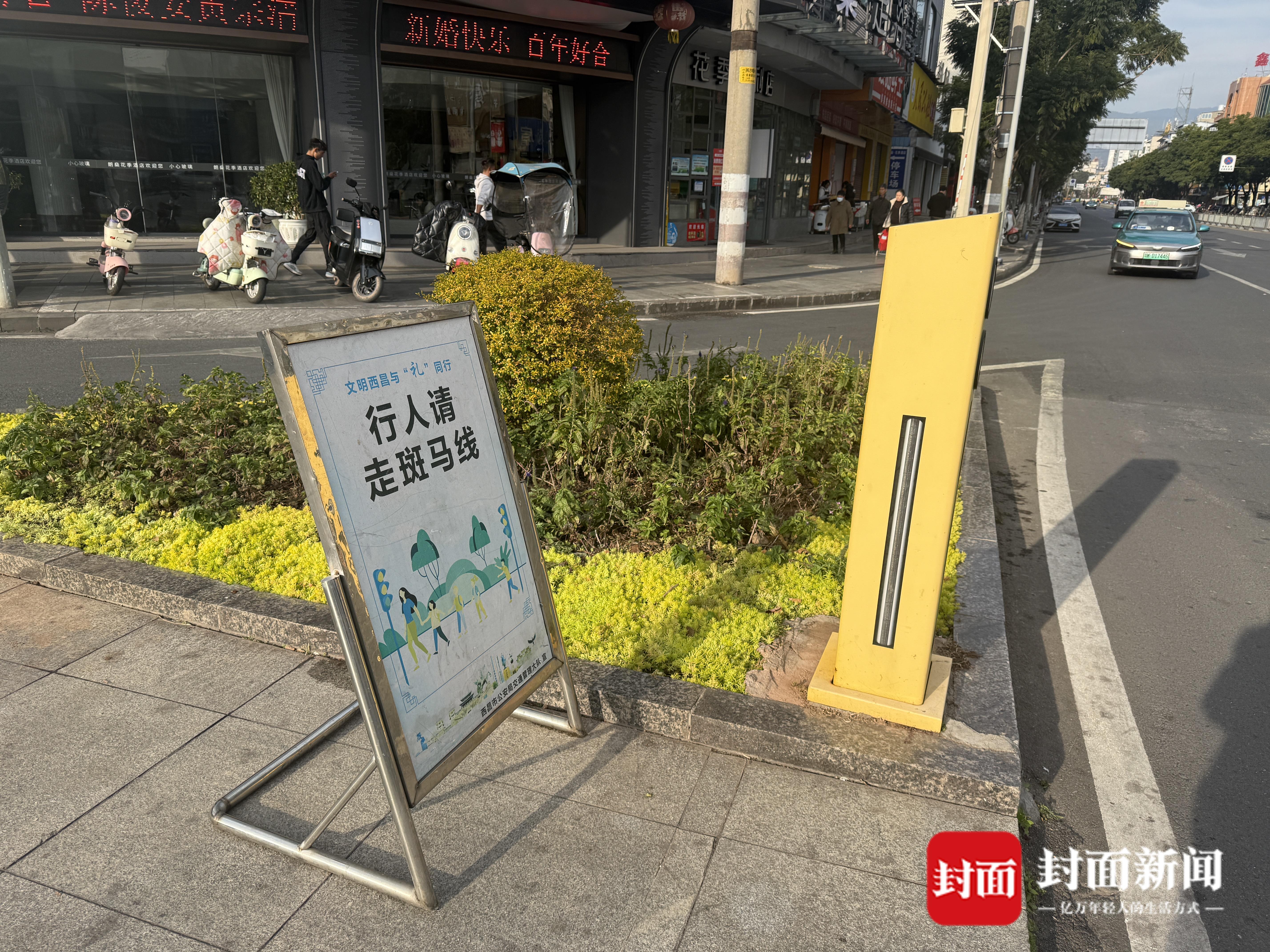 路口设置“行人请走斑马线”提示牌
