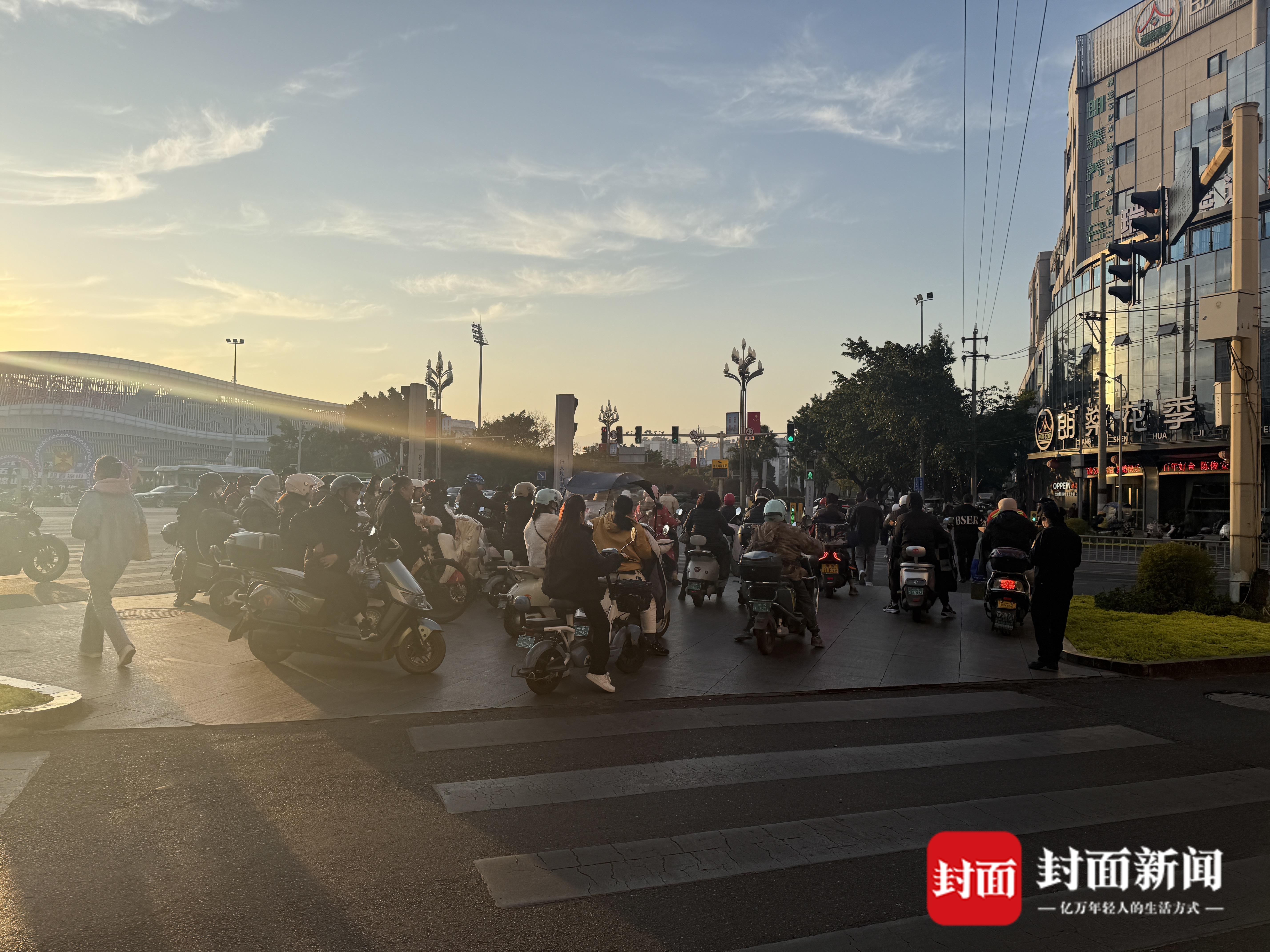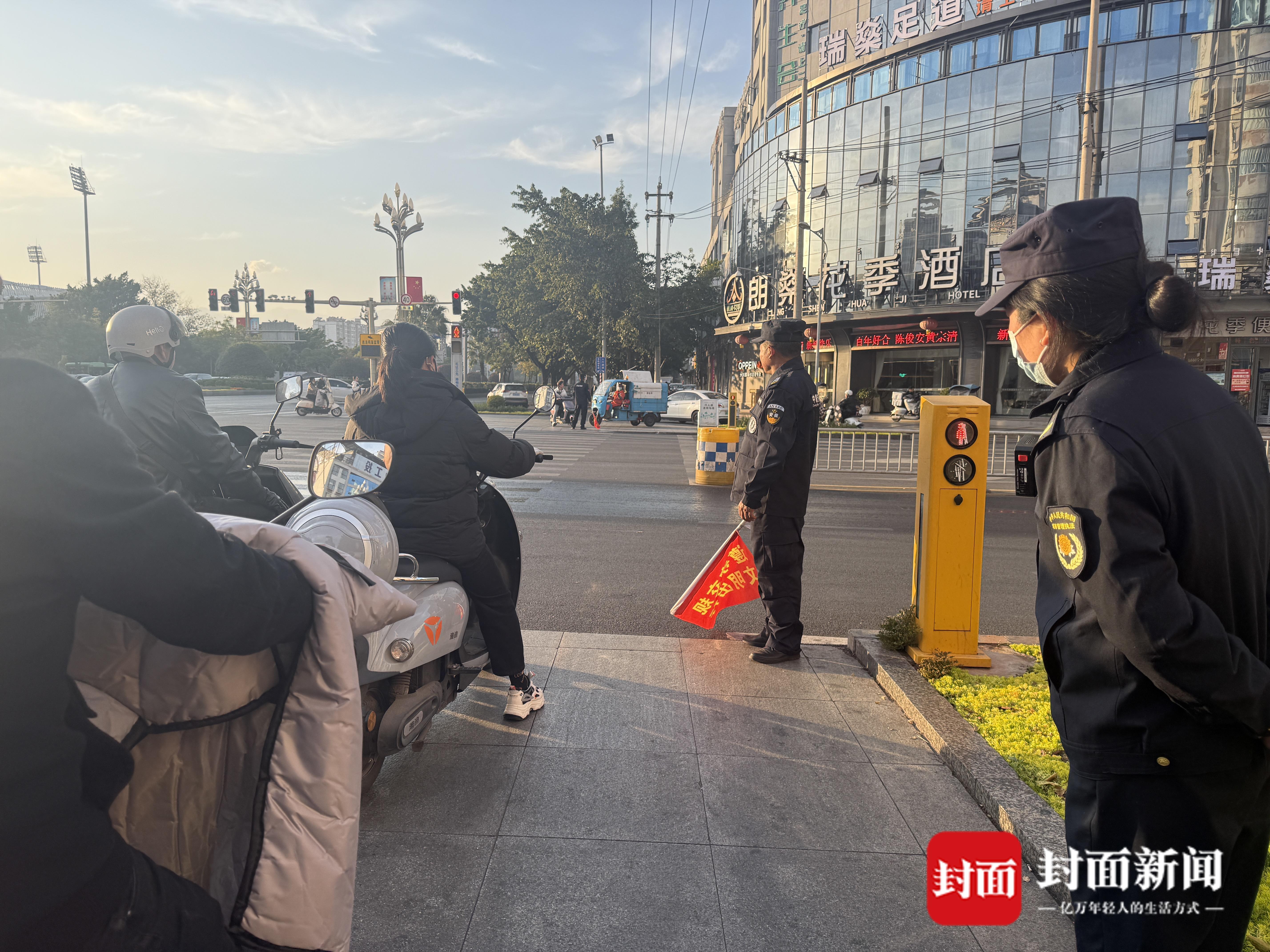 “我们要守到快7点钟。”一名执勤人员表示。他们的手里拿着小红旗,上面写着“遵守交规、文明出行”,主要工作是站在路口劝导行人遵守交通规则,不闯红灯,同时也劝导骑电瓶车的市民顺时针过马路。