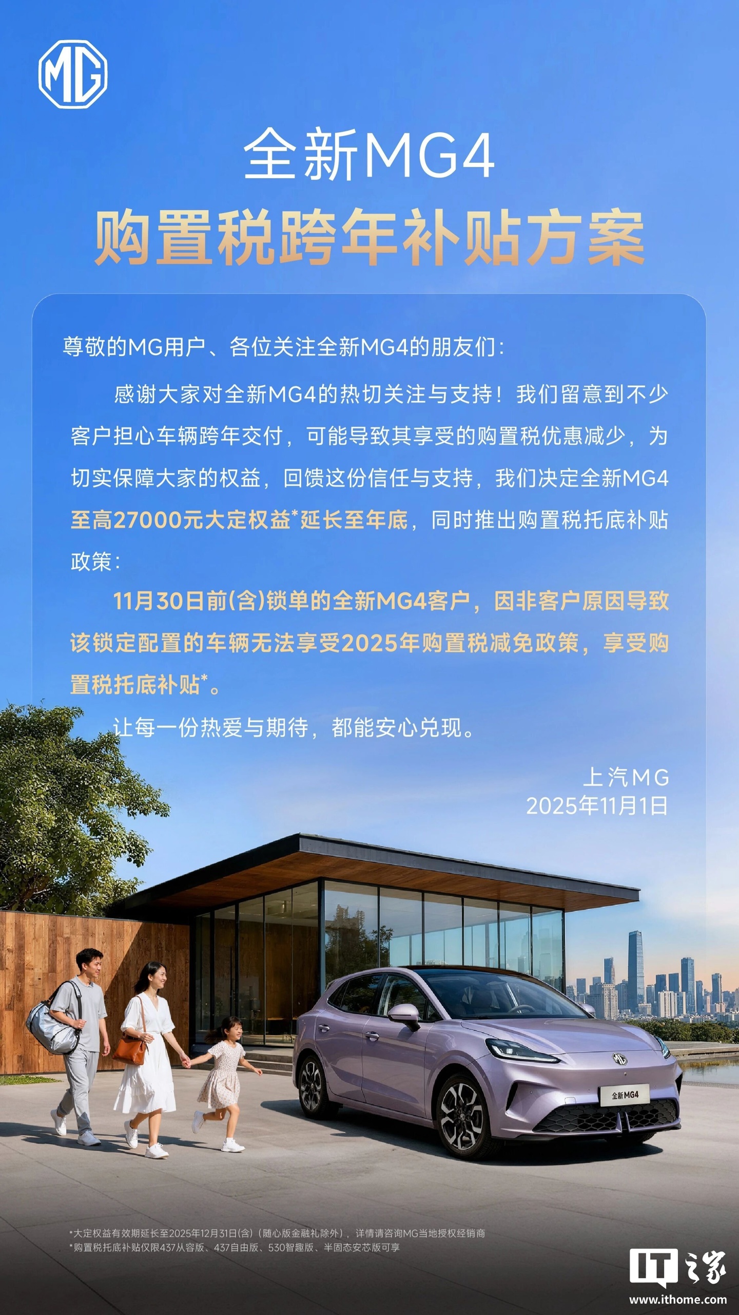 上汽 MG 还在 11 月 1 日宣布,全新 MG4 至高 27000 元大定权益延长至年底,同时推出购置税托底补贴政策:11 月 30 日前 (含) 锁单的全新 MG4 客户,因非客户原因导致该锁定配置的车辆无法享受 2025 年购置税减免政策,享受购置税托底补贴。